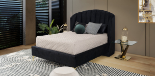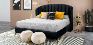 Cama tapizada Anika de estilo contemporáneo, estructura en madera de pino de una durabilidad inigualable, soporte central, tapizado que le da un plus de comodidad moderno y sofist ...
