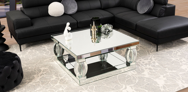 Mesa de centro Génesis. Diseño atemporal y de gran durabilidad gracias a sus materiales de alta calidad. La combinación de espejos y cristales dispuestos en formas geométricas dan un aire de sofisticación a tu estancia.