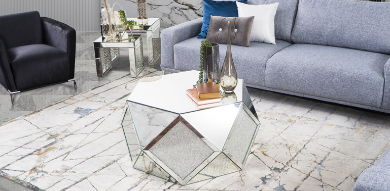 Mesa de centro Kamil. Fabricada en una combinación de espejos y cristales incrustados dispuestos en forma de diamante, dan un aire de sofisticación a tu estancia.