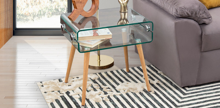 Mesa lateral Oviedo. Cubiertas fabricadas en cristal curvo con patas de madera de haya natural. Armonizara con tu decoración dando una sensación de elegancia.